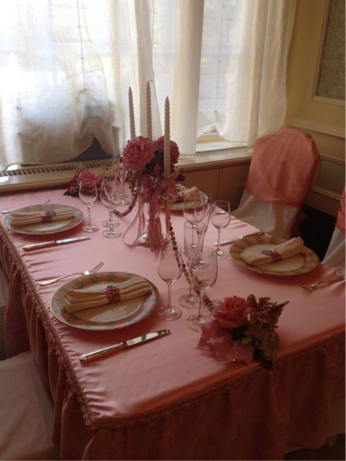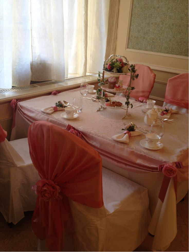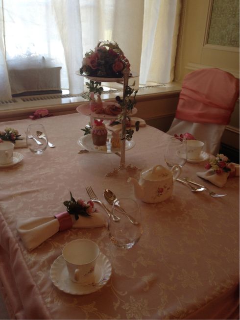 こちら、ビュッフェ台の側のテーブル*お茶会の飾りつけがしてあるの♪